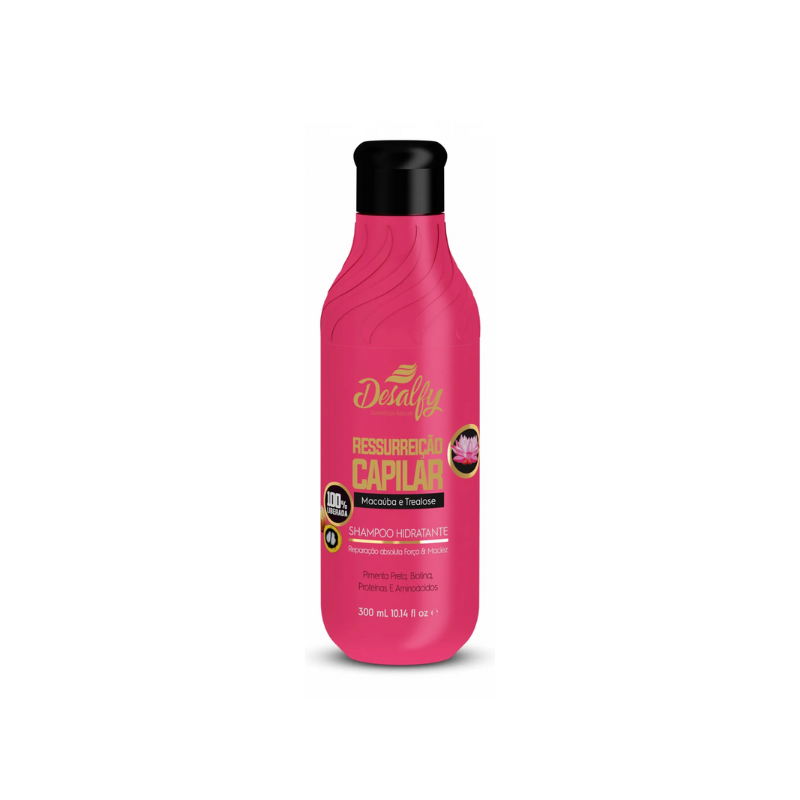 MODO DE USAR: Aplique o Shampoo Hidratante Ressurreição Capilar Desalfy nos cabelos molhados, massageando suavemente. Enxágue bem. Se necessário repita a aplicação.